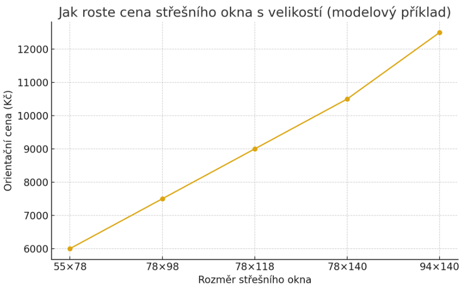 Ukazuje modelový příklad, jak roste cena jednoho „typického“ střešního okna s velikostí: