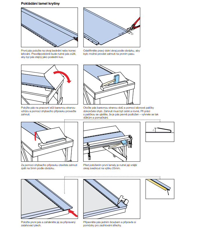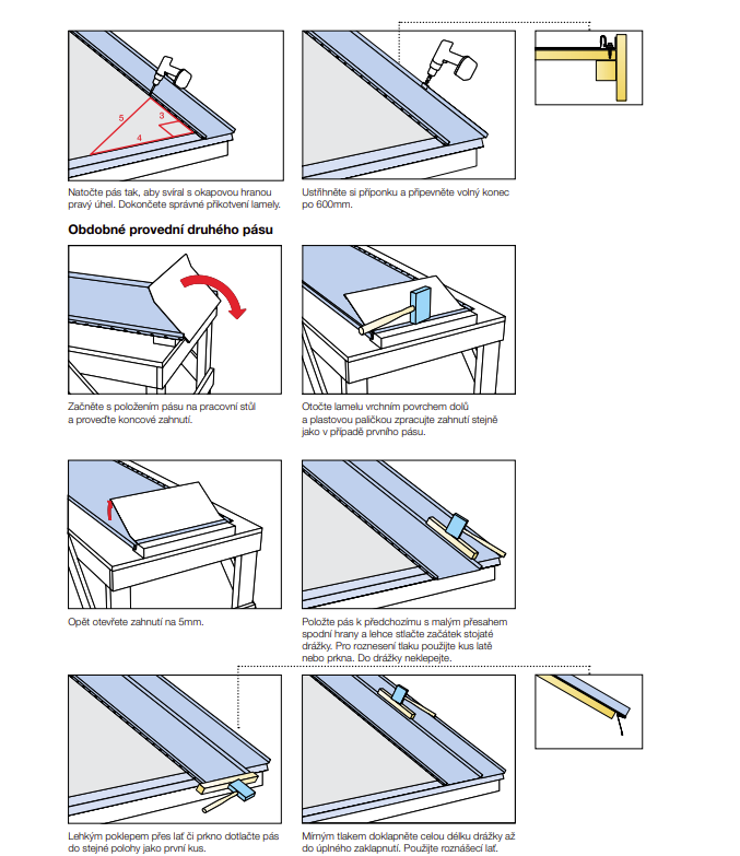První pás určuje směr celé střechy. Musí být položen přesně kolmo na okapovou hranu a správně ukotven. Jakákoliv odchylka se projeví na celé ploše střechy.