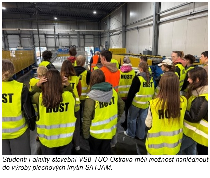 Společnost SATJAM, která je předním českým výrobcem lehkých plechových krytin, dbá nejen na kvalitní produkci, ale velký důraz klade i na vzdělávání a předávání informací odborné veřejnosti. V listopadu proto uspořádala ve svém ostravském výrobním závodě odbornou exkurzi pro studenty Fakulty stavební VŠB-TUO Ostrava. Akce se zúčastnili studenti prvních ročníků architektury a třetích a čtvrtých ročníků studijních oborů Realizace staveb III. a Obvodové pláště budov.
